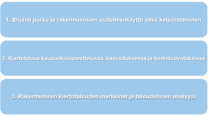 Myös rakentamisen kiertotalouden taloudellinen puoli nousi aineistossa esille. Minkälaisia taloudellisia vaikutuksia kiertotalouden ratkaisuilla ja kokeiluilla on? Millä tavalla onnistumisista ja epäonnistumisista voitaisiin oppia, jotta rakentamisen kiertotalous on taloudellisesti kannattavaa toiminnan mittakaavasta riippumatta? Kiertotalousklusterin toiminnalta toivottiin lisää taloudellista näkökulmaa ja liiketoimintamalleja – liiketoiminnan kannattavuuden kasvattaminen kasvattaisi myös investointeja kiertotalouteen.