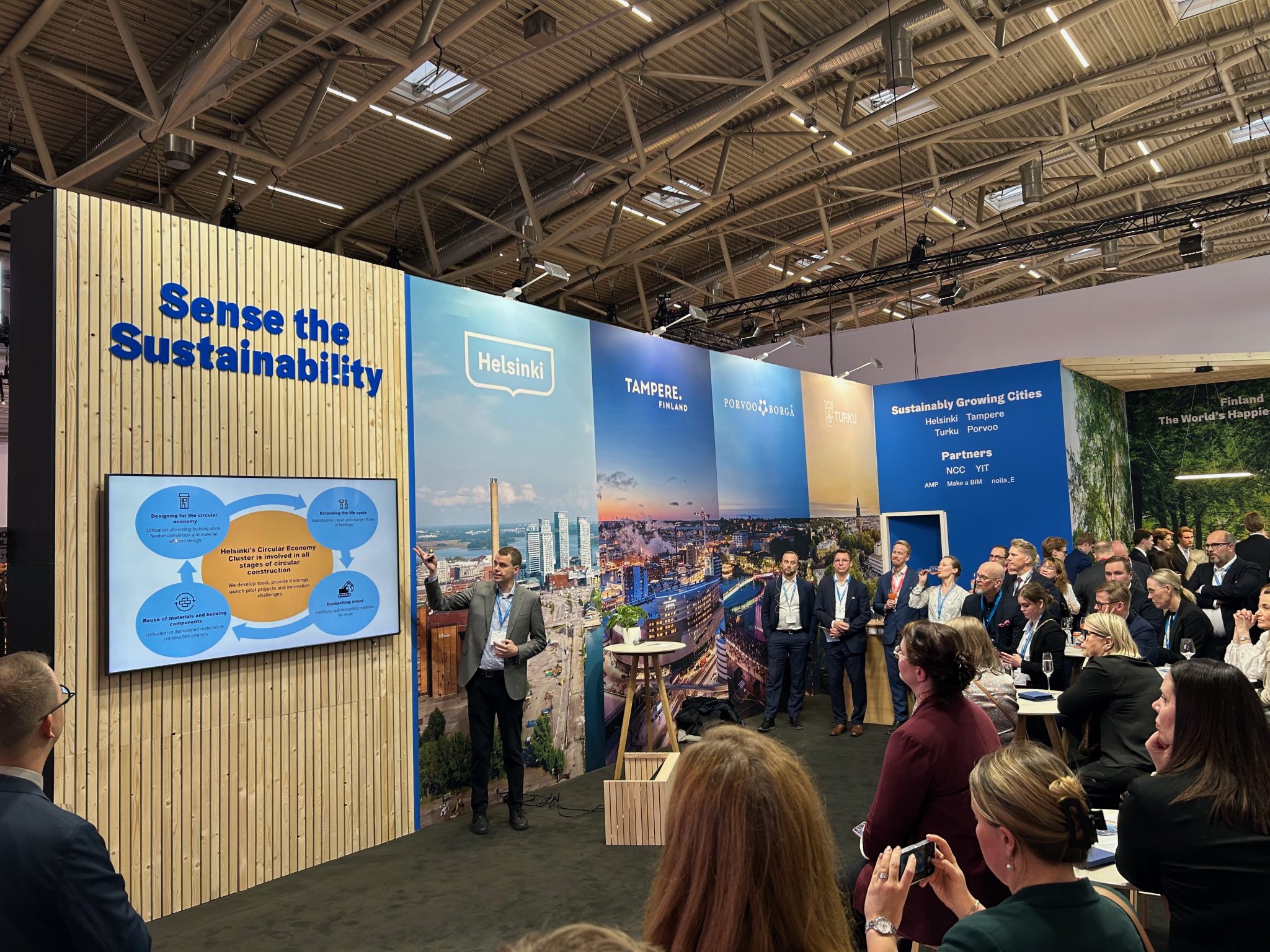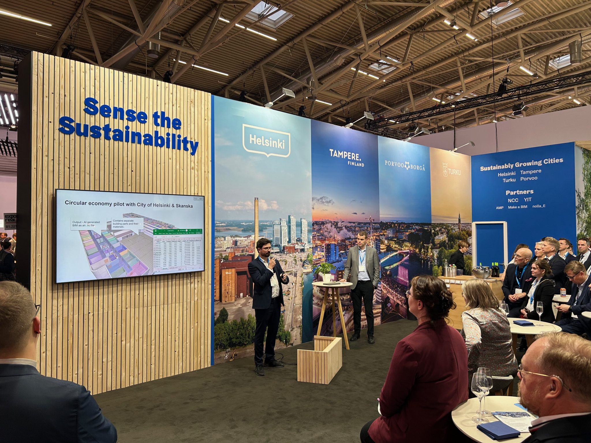 Mukana Helsingin osastolla oli Tampereen, Turun ja Porvoon kaupunkien edustajia sekä Helsingin kiertotalousklusterin toiminnassa mukana olleita innovatiivisia yrityksiä: tekoälyavusteisten BIM-mallien hyödyntämiseen keskittyvä Make A BIM, talotekniikan uudelleenkäyttöä edistävä nolla_E, sekä kiertotalouden markkinapaikkaa aktiivisesti kehittävä AMP-yhtiöt Oy.